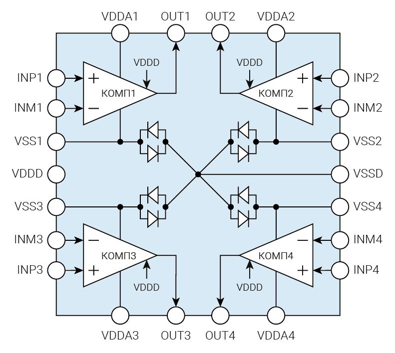 Уровень лог. «1» выходного напряжения компараторов устанавливается выводом VDDD в диапазоне от 2,5 В до 5,0 В.