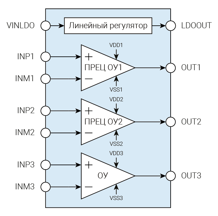 В состав микросхемы входит линейный регулятор напряжения, который позволяет запитать микросхему от импульсных источников.