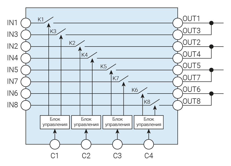 Микросхема К5400ТС02ВУ осуществляет коммутацию одного из 2-х входов на общий выход в соответствии с управляющим сигналом С1.