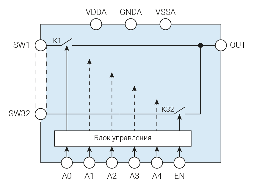 В микросхеме реализована функция «разрешения»: при EN = «0» все ключи закрыты вне зависимости от состояния управляющих выводов A4, A3, A2, A1, A0.