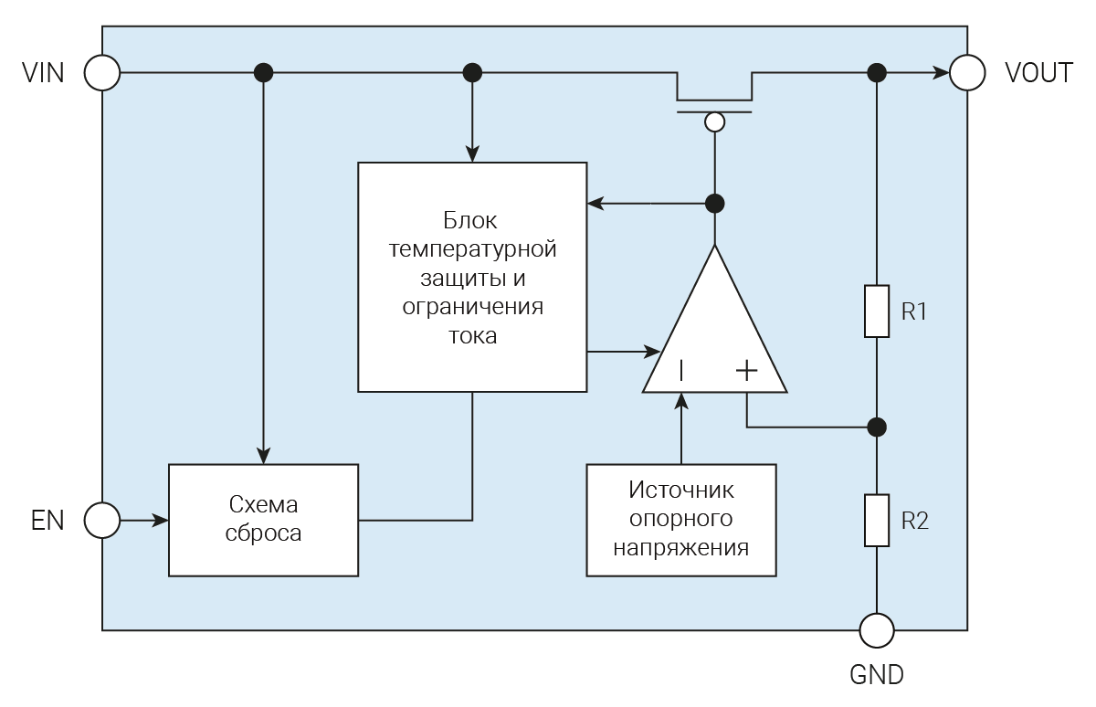 4,5 В...5,5 В; 100 мА линейный регулятор напряжения с температурной защитой и функцией ограничения тока