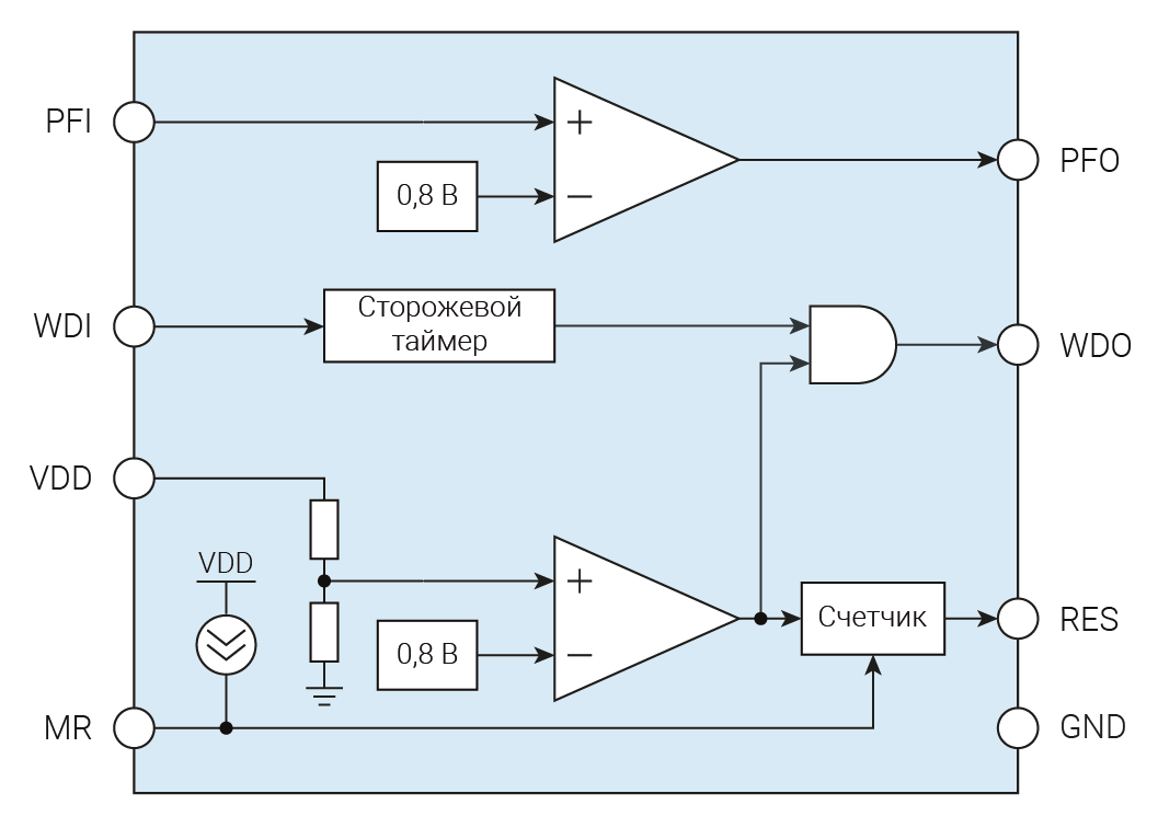 В микросхеме реализован компаратор сбоя питания для контроля произвольного уровня напряжения. Настройка контролируемого напряжения срабатывания осуществляется с помощью внешних резисторов.