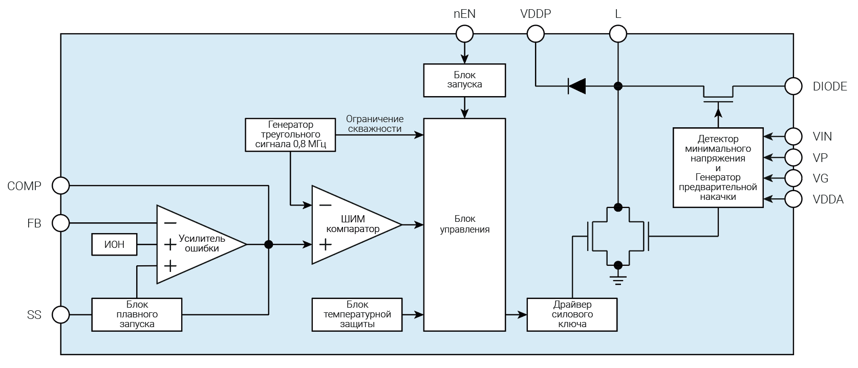 Микросхема К1397НН2У – повышающий импульсный преобразователь напряжения с интегрированным силовым ключом. Диапазон входного напряжения от 1,0 В до 5,0 В, выходное напряжение настраивается внешним резистивным делителем в диапазоне от 3,0 В до 5,5 В. Допустимый ток нагрузки до 100 мА. Выходной каскад имеет тепловую защиту для защиты микросхемы от некорректной работы: силовой ключ закрывается, конденсатор плавного запуска разряжается, происходит перезапуск микросхемы.