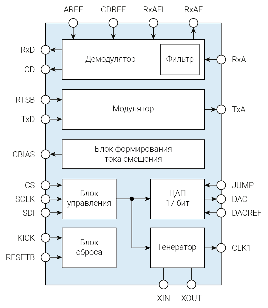 Микросхема обеспечивает фильтрацию входного сигнала, детектирование несущей, демодуляцию, модуляцию и формирование выходного сигнала.