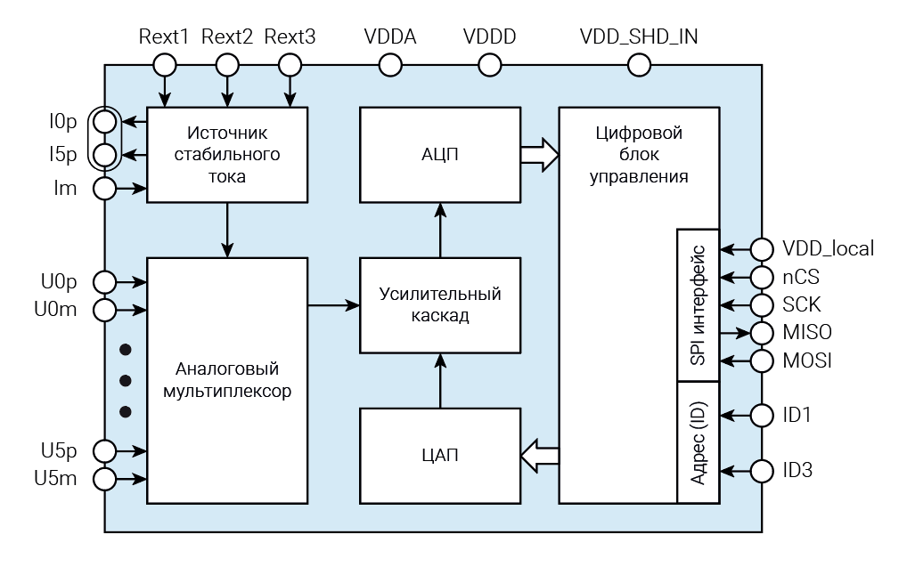 Микросхема 5400ТР015-040 предназначена для опроса резистивных или диодных датчиков температуры по четырёхпроводной схеме с одновременной поддержкой 6 опрашиваемых каналов. Основная функция устройства – измерение напряжения на резистивных или диодных датчиках температуры с последующим их усилением и аналого-цифровым преобразованием.