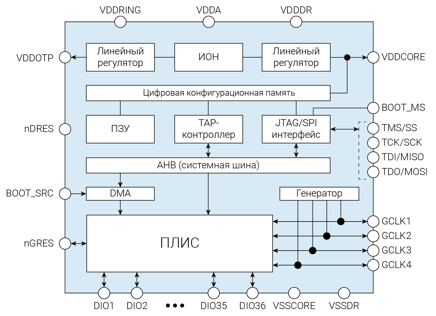 Микросхема 5400ТС015 – программируемая логическая интегральная схема (ПЛИС) для реализации на стороне пользователя различных логических схем или схем управления.