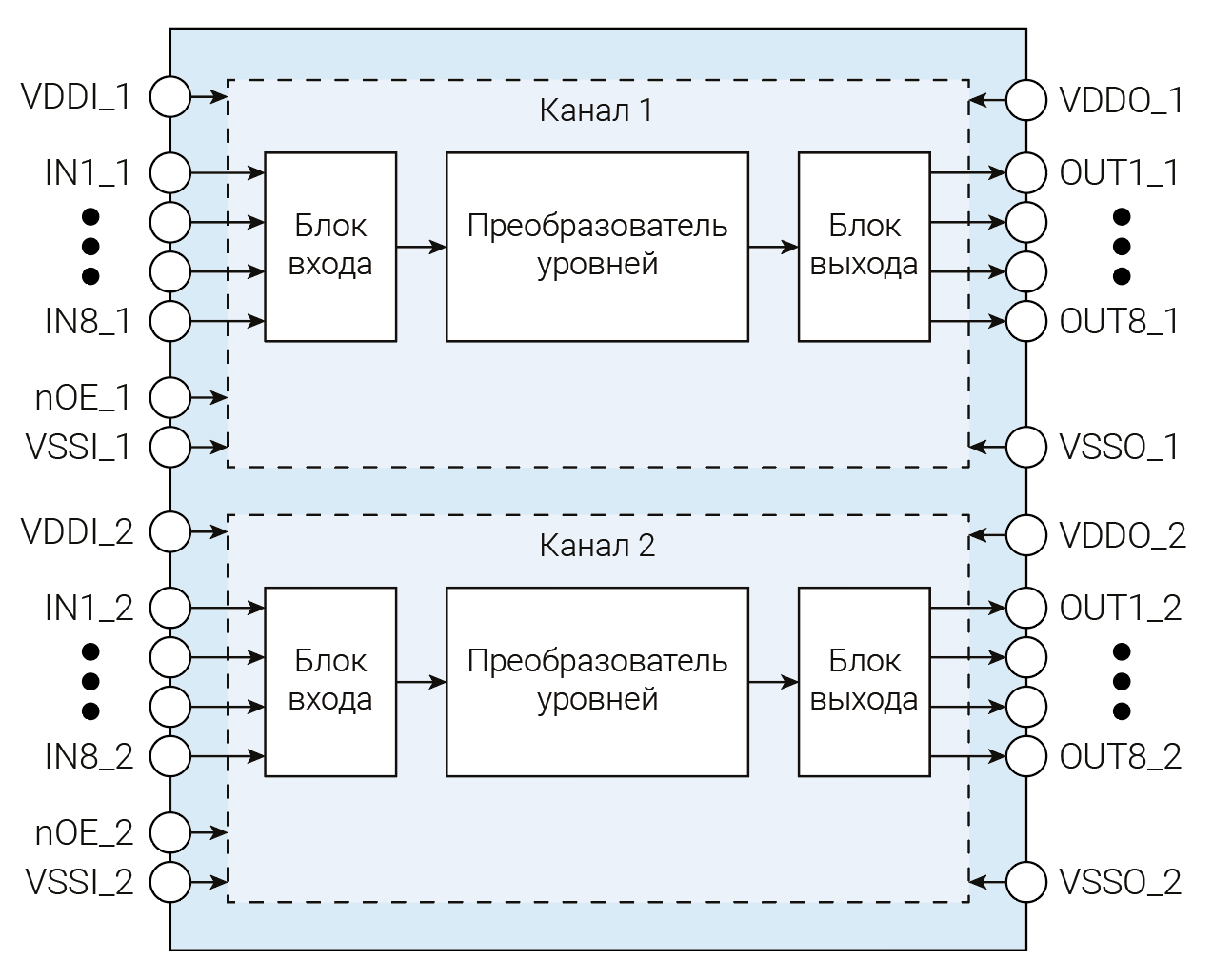 Каждый канал имеет свои выводы питания и сигнал управления nOE. Микросхема может работать как 16-разрядный формирователь, так и как два независимых 8-разрядных формирователя.