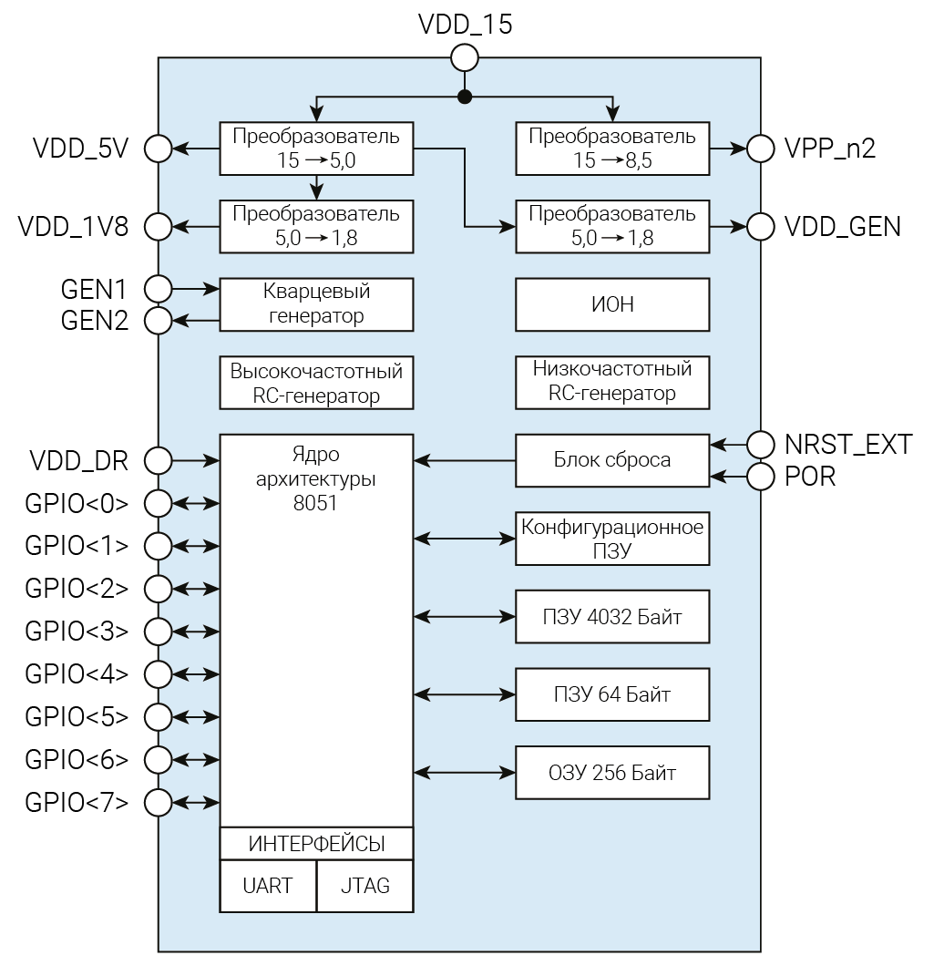 Микросхема 5400ВК025 – контроллер с архитектурой ядра 8051 с диапазоном рабочих частот до 8,0 МГц. В микросхеме реализована возможность переключения способа тактирования: высокочастотный генератор (кварцевый генератор, RC-генератор, внешний источник) или низкочастотный генератор.