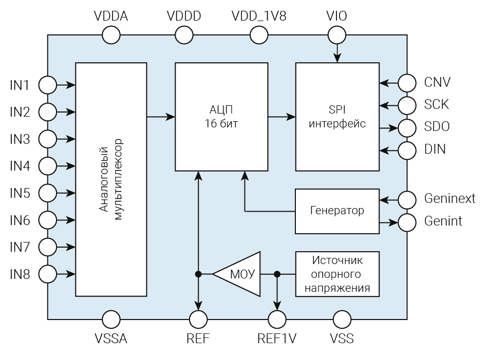 Микросхема К5400ТР045В-036 – 8-ми канальный 16-ти разрядный АЦП последовательного приближения с перераспределением заряда с последовательным интерфейсом выходных данных (формат: прямой код со смещением).