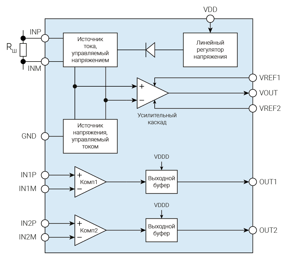 В микросхеме реализовано 2 независимых компаратора напряжения для контроля аварийного превышения тока и контроля уровня входного напряжения.