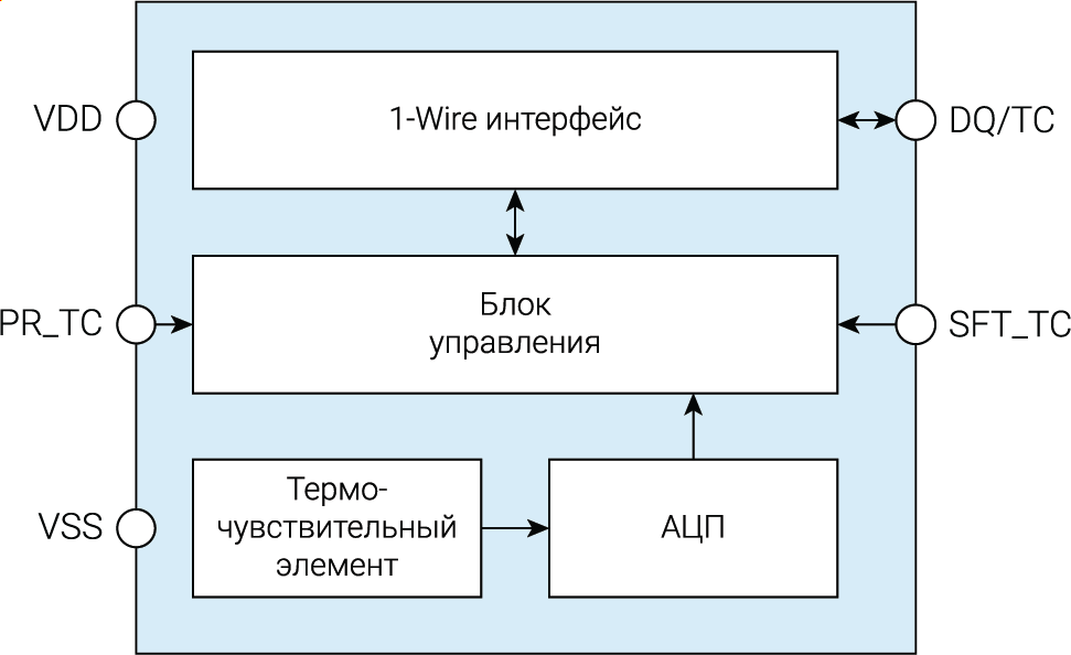 Интегральный температурный датчик К5306НТ04П/К5306НТ04У/К5306НТ04Т предназначен для преобразования значения температуры в цифровой код. Взаимодействие управляющего микроконтроллера с микросхемой осуществляется по 1-Wire интерфейсу.